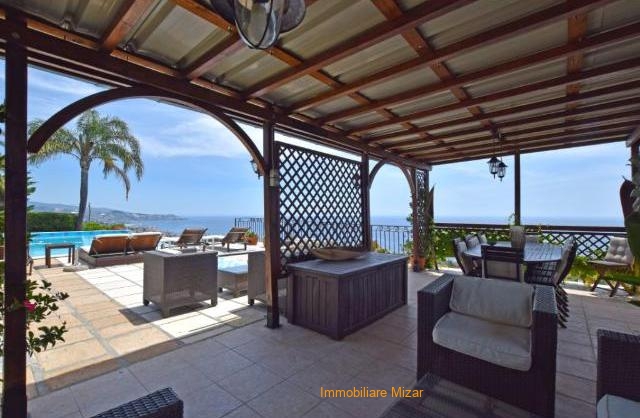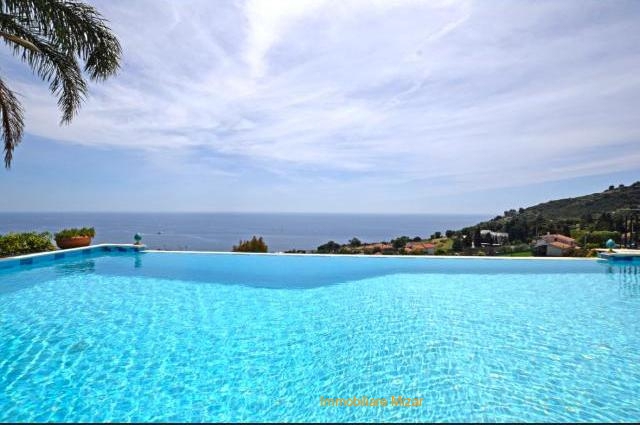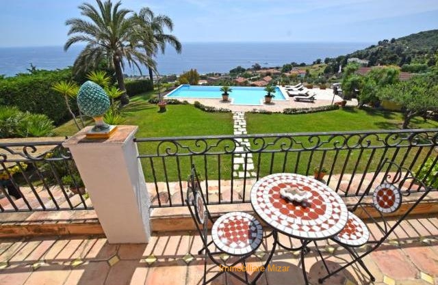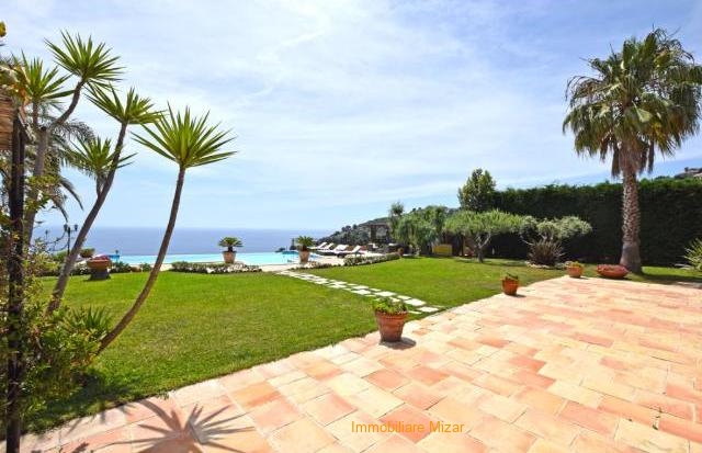 Giardino pianeggiante di 1000 mq con piscina a sfioro sul mare e gazebo con zona relax e tavolo da pranzo. Vista unica su Sanremo